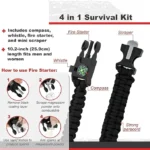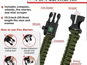 - 4-in-1 Survival Kit: The Survival Paracord Bracelet is a versatile tool that combines essential survival components. It features a utility wristband compass to help you maintain your sense of direction. In case you get lost, the survival whistle can be used to make an SOS call. Additionally, the bracelet includes paracord and a flint fire starter kit for setting up a campsite.