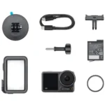 This Standard Combo pairs the Osmo Action 3 camera with a high-capacity battery, a magnetic 3-prong mount, a protective frame, two rubber lens protectors, a quick release adapter mount, a flat adhesive base, a locking screw, and a USB Type-C charging cable.