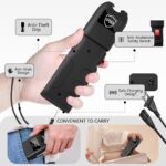 - ULTRA SHARP SPIKE ELECTRODES : Helps penetrate through thick clothing. COMPACT SIZE: 6.5” long x 2” wide x 1″. This stun gun also comes with free wrist strap and holster case for easy everyday carrying.